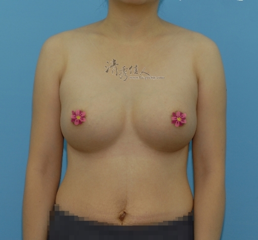 身高159公分,下胸圍70公分,乳距17.5公分,胸大肌下植入左、右各325cc義乳