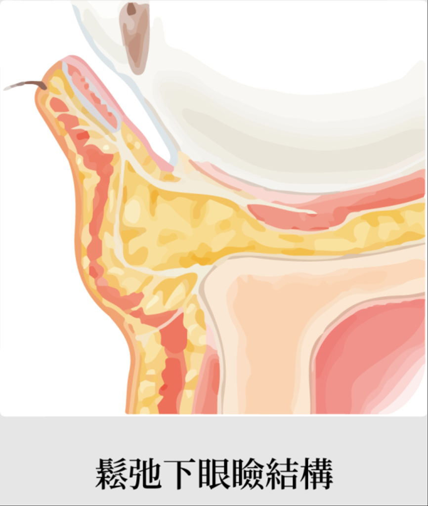 位於臥蠶下方,由脂肪、筋膜與皮膚形成,隨著年齡老化會造成肌肉、筋膜、皮膚鬆弛,進而導致眼下脂肪明顯垂墜突出。
